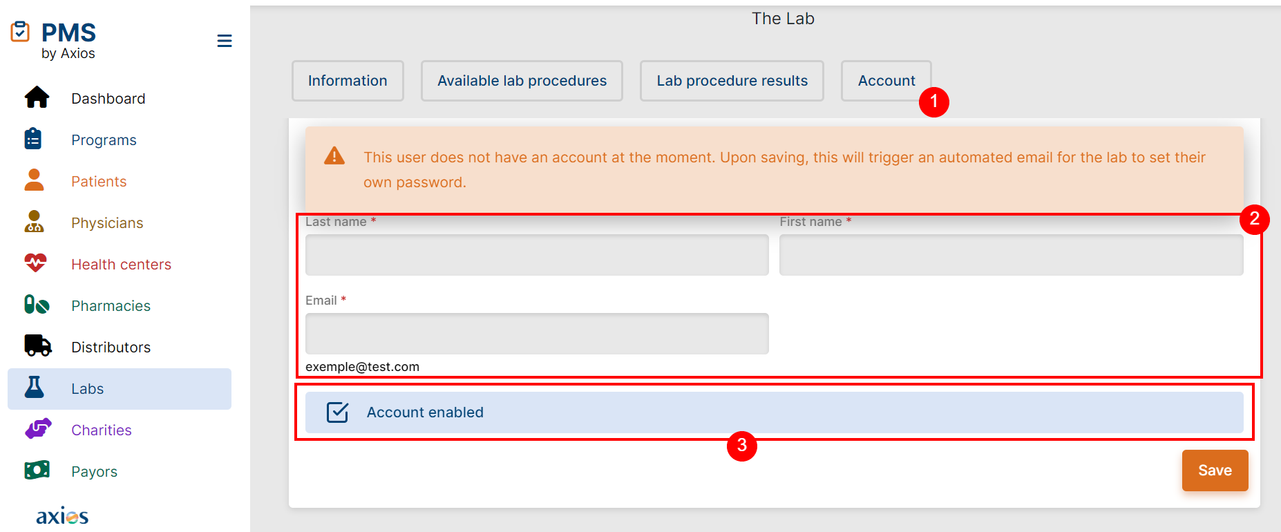In case the Lab must change their email account to use the Platform, please contact pms.support@axiosint.com to assist with the change.