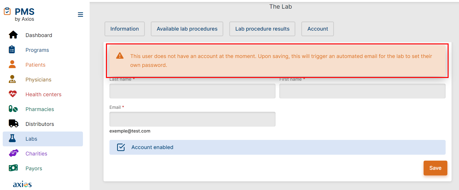 Once the Lab’s account is enabled, the PMS will automatically send an email to them for them to set their own password. Once Labs have set their own password, they can log into the Platform. Their username will be their email address, and their password the one they have just set.