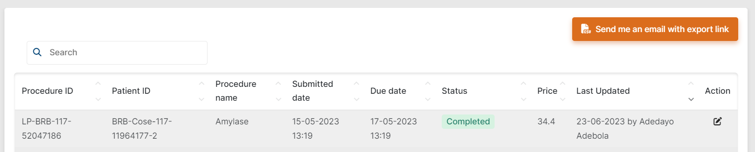 This tab provides a comprehensive view of both ongoing and previous procedures that the Lab has conducted. One notable aspect of this feature is that it's automatically sorted. The procedures are arranged in descending order based on the Sent Date, so the most recent procedures are right at the top. This makes it easy to identify and access the most recent lab procedures that have been requested, scheduled, completed etc.