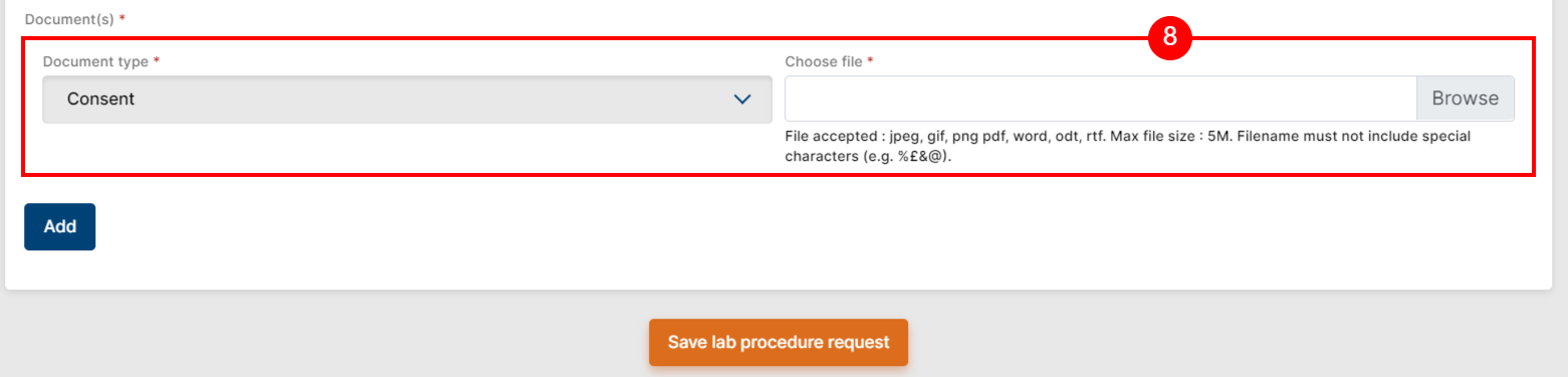 - Document upload - To save the lab procedure request, it is necessary to upload at least one document of the "Prescription" type. Prior to this you can save the procedure as Draft to save progress and return later.