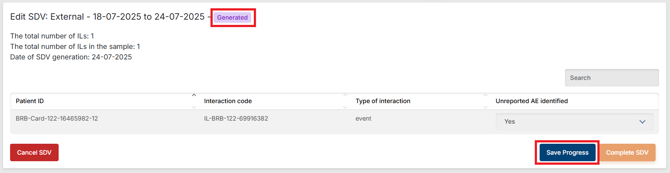Progress can be saved using the “Save Progress” button. When clicked, all changes to the SDV sample are saved but the SDV remains in “Generated” status.