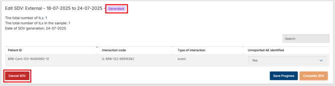 - The Generate SDV button is greyed out until the existing SDV of the same SDV type is validated or canceled.